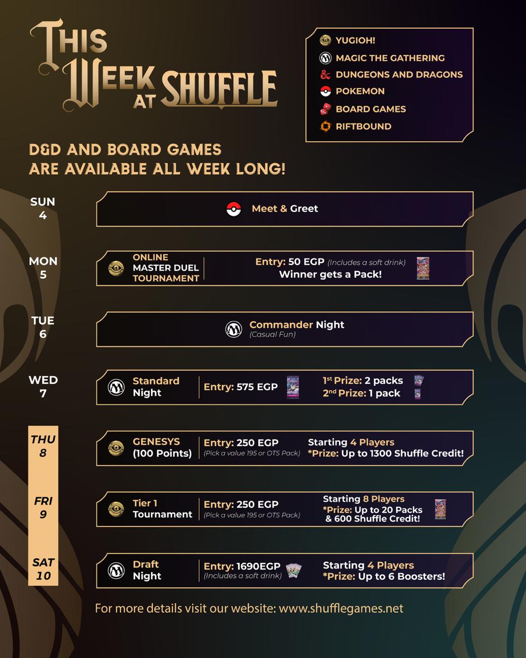 Whether you’re battling in tournaments, learning the basics, diving into D&D, or cracking packs with the squad — Shuffle is your home all week long. -